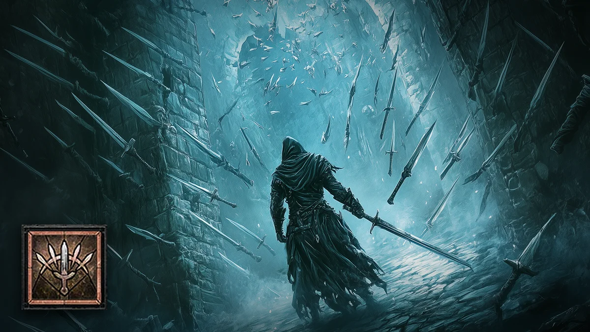 Du wirfst Klingen über eine kurze Distanz und verursachst X% Schaden. Jeder 3. Einstich verlangsamt Gegner X Sek. lang um X%. Kritische Treffer verlangsamen immer.